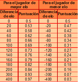 El profesor Elo estableció una tabla que denominó «Percent Scoring Expentancies as a Function of Rating Differences» que recoge las expectativas de victoria en función de la diferencia de ratings.