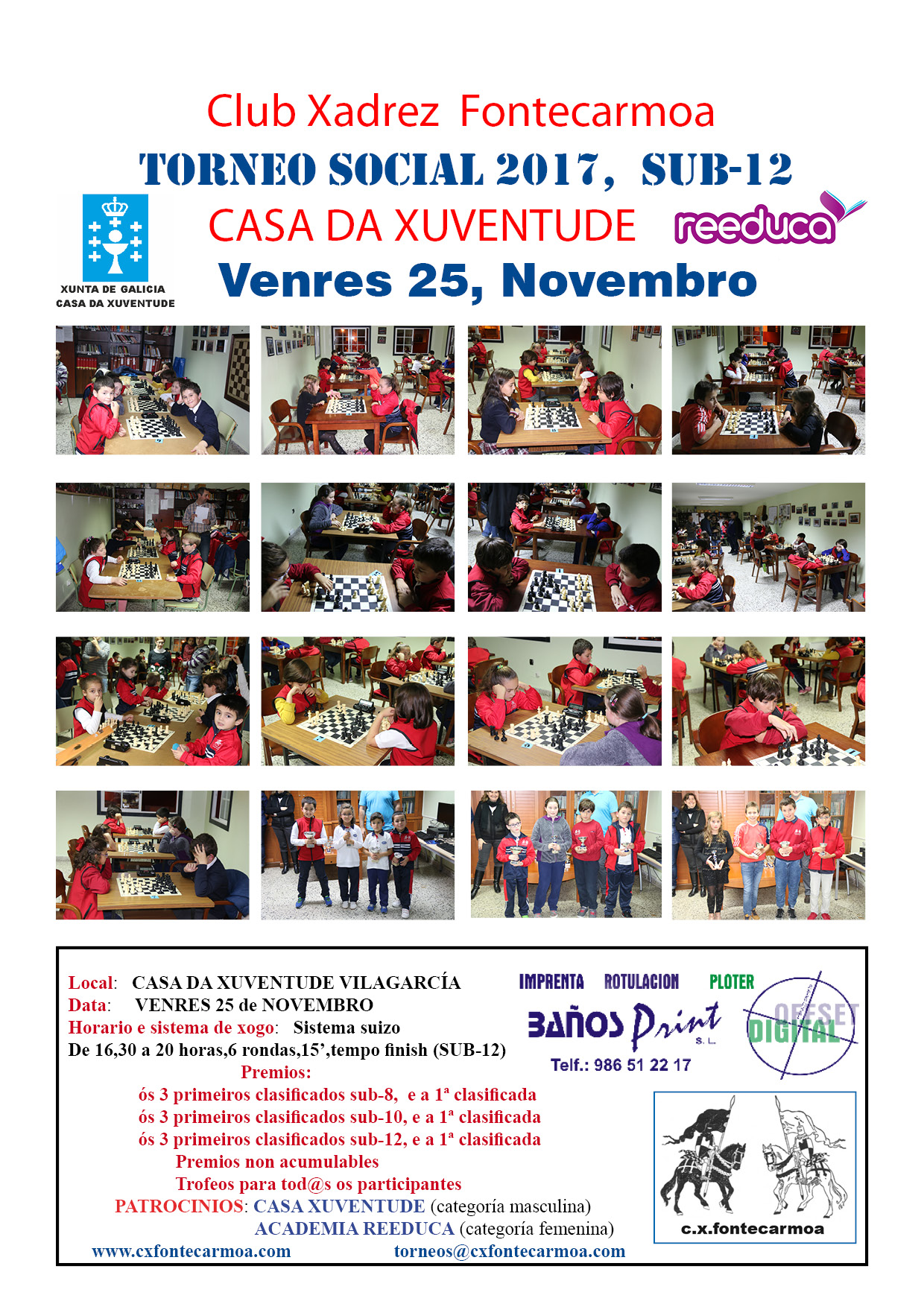 El viernes, 25, se celebra el campeonato destinado a los chic@s menores de 12 años (cumplidos en el año 2017, es decir, los nacidos en el año 2005 y posteriores). Estará desglosado por categorías: sub-8, sub-10 y sub-12. El sistema de competición es un sistema suizo a 6 rondas, comenzando a las 16,30 horas. En el caso de que algún jugador no pueda participar en alguna ronda, debe hacerlo saber a la organización, para así no emparejarlo y que quede su rival sin jugar.
