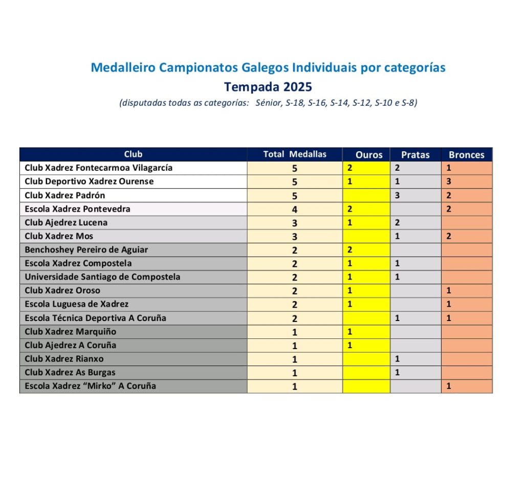 Estás últimas medallas conseguidas por los jugadores arousanos, aupan al Fontecarmoa al liderato del medallero, quedando como mejor club de Galicia por delante del Xadrez Ourense, Ajedrez Padrón, Xadrez Pontevedra y Lucena de Vigo, que lo siguieron en la clasificación.