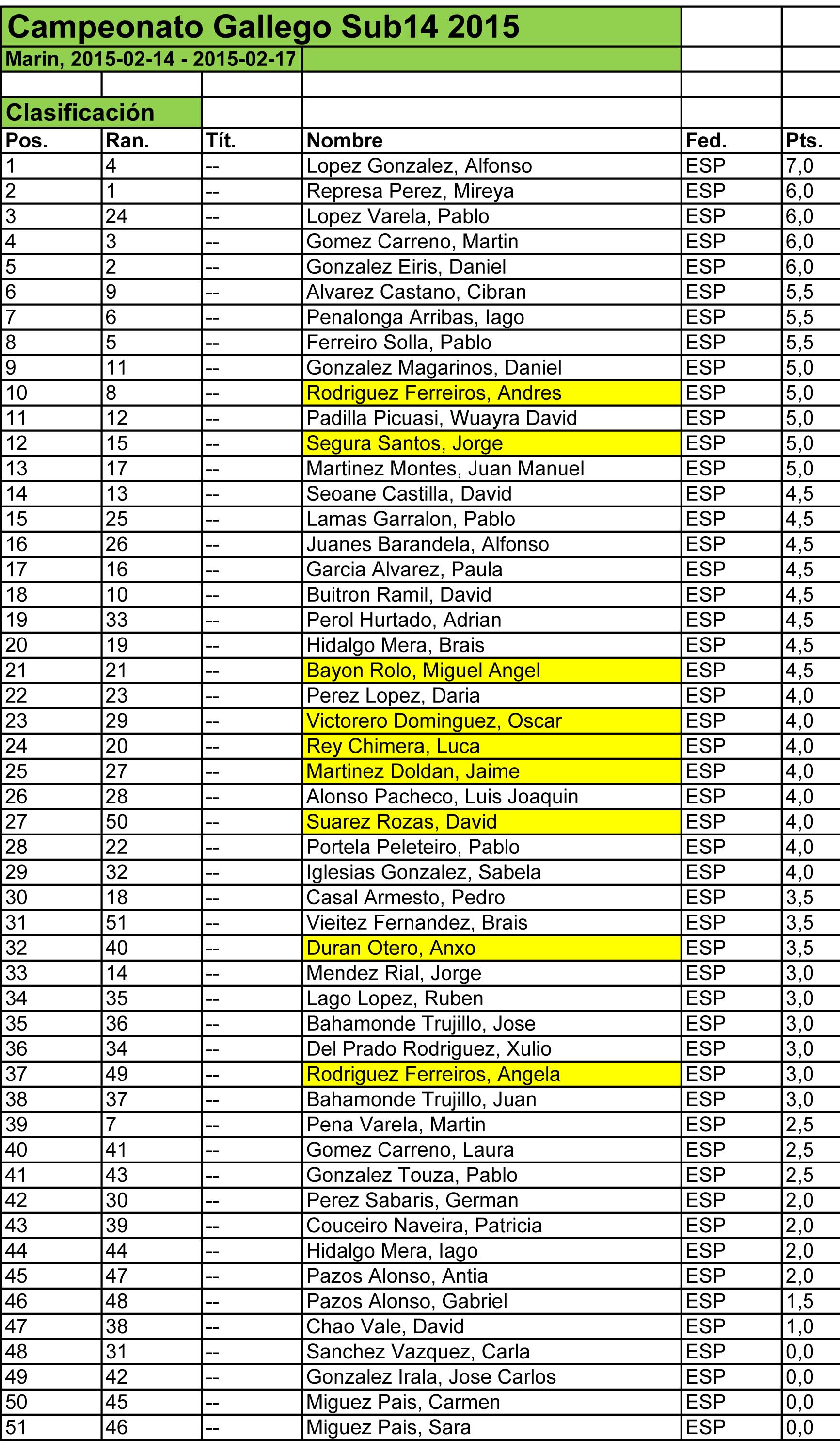 En la categoría sub14 el campeón fue Alfonso López, siendo la segunda clasificada y campeona femenina Mireya Represa. El tercer clasificado fue Pablo López. El mejor clasificado del Club Xadrez Fontecarmoa fue Andrés Rodríguez Ferreirós, que con 11 años consiguió 5 puntos de los 8 en juego y el décimo puesto. Con los mismos puntos quedó Jorge Segura Santos en duodécima posición. En total fueron 9 los jugadores del CX Fontecarmoa que participaron en esta categoría.