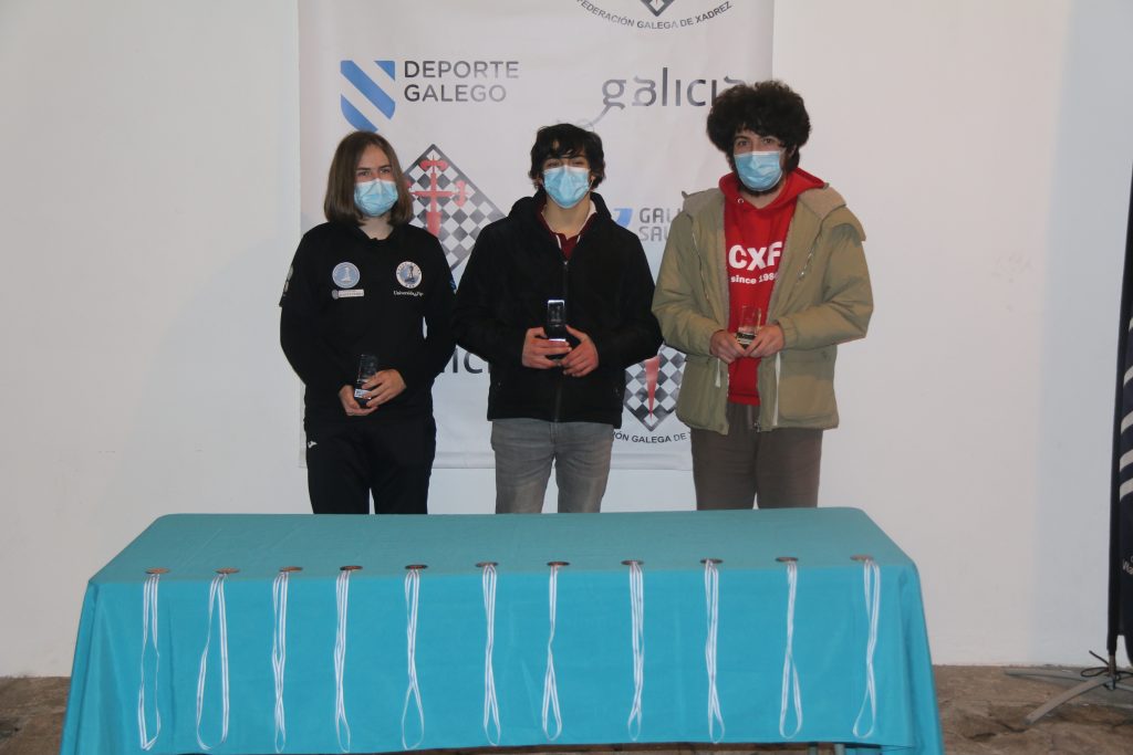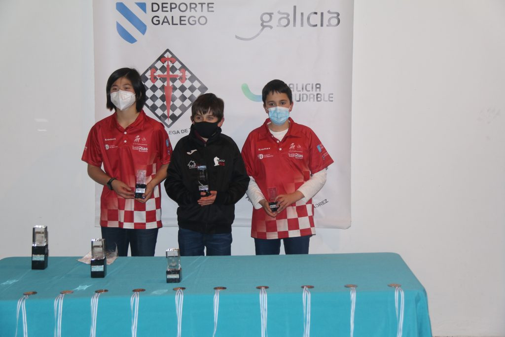 Na categoría sub14 a emoción estivo servida hasta a última ronda. Chegaron a ela 4 xogadores empatados a 5 puntos. Dúas deles, Irene e Noa xogaron entre elas na primeira mesa e os outros dous nos taboleiros dous e catro. Os resultados da ronda definiron o podio, quedando no primeiro lugar Javier del Valle, do Xadrez Mos. Acompañouno á súa dereita Irene Diz e a súa esquerda Ricardo Oubiña, ambos os dous do club anfitrión, o CX Fontecarmoa.