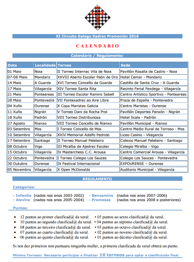 Se adjunta el calendario del Circuito Promoción de la Federación Galega de Xadrez 2016, destinado a jugadores menores de 14 años.