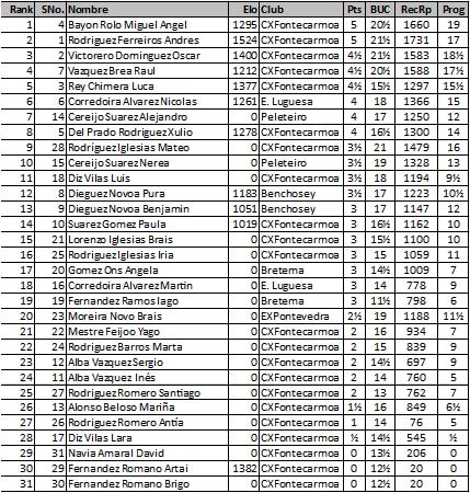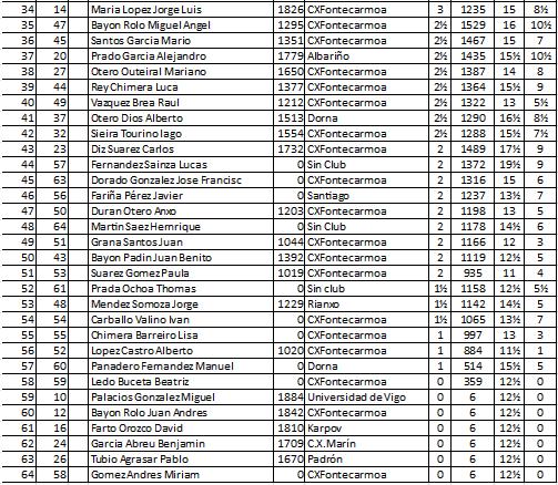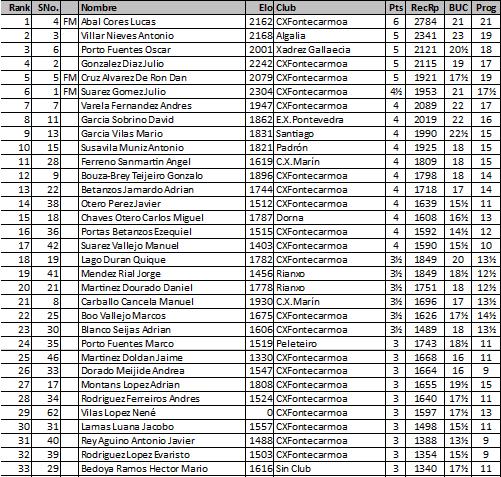 Torneos 2016 Clasificaciones III Torneo Mesón Derby Jose Luis Bouzada hace 10 años Lectura de 1 minutos 0 comentarios Clasificación Sub 16 Clasificaciónes absoluto. Acerca del autor Jose Luis Bouzada Administrator Visitar sitio web Ver todas las entradas Navegación de entradas Anterior: II TORNEO XADREZ TAPERIA A VILA 2016 (Nota de prensa)Siguiente: III TORNEO XADREZ MESON DERBY 2016 (Nota de prensa) Deja una respuesta Cancelar la respuestaTu dirección de correo electrónico no será publicada. Los campos obligatorios están marcados con *Comentario * Nombre * Correo electrónico * Web Guarda mi nombre, correo electrónico y web en este navegador para la próxima vez que comente. Historias relacionadas Torneos 2016 EL MF LUCAS ABAL SE IMPONE EN LA CATEGORIA ABSOLUTA EN EL TORNEO SOCIAL Jose Luis Bouzada hace 9 años 0 Torneos 2016 CAMPEONATO SOCIAL DEL CLUB (VIERNES 25, SÁBADO 26 NOVIEMBRE) Roberto Vidal hace 9 años 0 Torneos 2016 X OPEN XADREZ McDONALDS VILAGARCIA 2016 (resumen) Jose Luis Bouzada hace 9 años 0